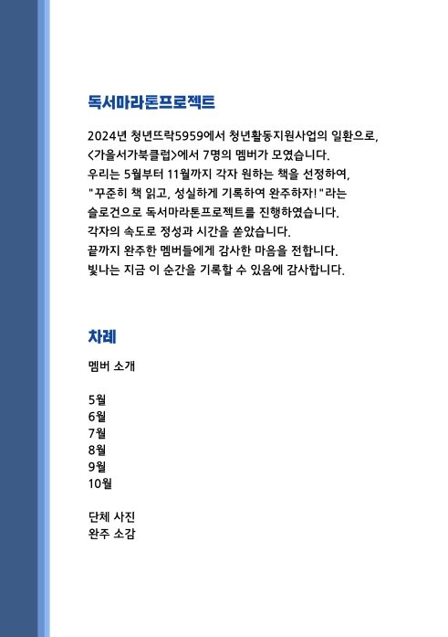 2024년 4월에 결성 된 독서마라톤프로젝트. 가을서가북클럽의 7명의 멤버가 모여 함께 완주하기까지의 과정을 기록한 책입니다.