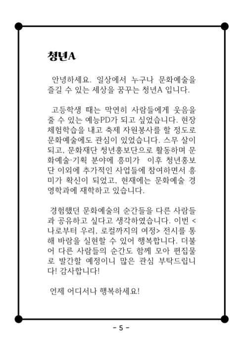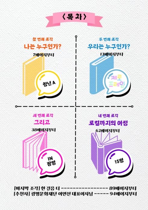 청년의 시선에서 문화예술과 로컬의 이야기를 담았습니다. 나로부터 우리가 되고, 로컬로 확장하는 과정과 커뮤니티의 의미를 쉽고, 따뜻하게 풀어냈습니다.